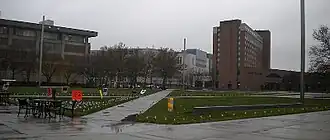 Untitled (L's), a public sculpture by American artist David Von Schlegell, is located on the Indiana University-Purdue University Indianapolis campus, which is near downtown Indianapolis, Indiana. The sculpture is located just north of Joseph Taylor Hall in a grassy courtyard adjacent to Michigan Street. Cavanaugh hall frames the courtyard to the west, the library and Business building are east of the courtyard. This sculpture was created in 1978, and installed at IUPUI in 1980. The sculpture is a Minimalist composition of three identical steel L's. The L structures have a vertical beam that is 55 feet (17 m) tall and a horizontal beam of 45 feet (14 m). The beams themselves are 16 inches (410 mm) high and 12 inches (300 mm) wide.[1]