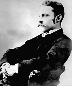 The architect Edgar Wood (1860–1935) came from a wealthy Unitarian background, and practised from around 1885 in the north west from offices in Middleton, and later Oldham and Manchester. Most of his British buildings are in that region. He considered architecture to be an artistic discipline; his interests encompassed vernacular architecture and cube-shaped Arabic domestic architecture.[3] Although his early buildings fall within the Arts and Crafts movement, his style changed through his career, and from around 1897 he started to be influenced by Art Nouveau.[4][5][6] An example is Banney Royd in Huddersfield (1900–1), a large house with Art Nouveau ornamentation, which employed some technical innovations.[3][7] He also designed a few highly unusual buildings, notably the expressionistic First Church of Christ, Scientist, Manchester (1903–7),[3][8] which Pevsner characterises as "weird".[9]