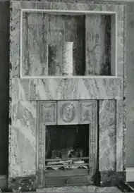 The large drawing room has panelling and a marble fireplace flanked with fluted pilasters and built-in cupboards; the fireplace is at the centre of a curved convex wall (not associated with the exterior concave curve of the entrance front[27]). The 17th-century-styled panelling in the dining room is not original;[1][20] this room has a built-in sideboard, perhaps designed by Wood,[20] and a fireplace of two shades of green marble, with a panel above of onyx-coloured Siena marble.[1][28] A garden room in the west part was not accessible from the interior in the original plan.[27][28]