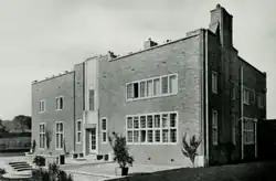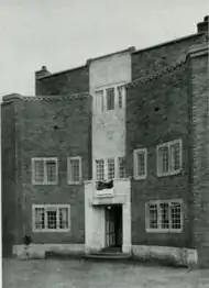 Upmeads is a grade-II*-listed[1] house on Newport Road in Stafford, Staffordshire, England, built in 1908 for a local businessman, Frederick Bostock, and his wife. The design by Edgar Wood is considered groundbreaking and a forerunner to Modernist architecture; Nikolaus Pevsner describes it as a "pioneer work and worthy of any book dealing with the pioneers of the C20 style internationally."[2] The double-depth house is in red brick and ashlar stone, with two storeys and attics, under a flat concrete roof. It features a concave recessed central section to the entrance front, emphasised by a full-height stone band; the garden front also has a recessed central section with a stone band but lacking the curved profile. The interior has groin-vaulted hallways, and there are marble fireplaces, wood panelling and moulded plaster ceilings and friezes.