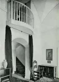 The house has an axial plan.[24] The main full-height entrance hall is at the rear, and is accessed from the garden front; it is groin vaulted and has a slightly projecting, curved balcony in an arched opening at the first-floor level.[1][24][28] This hall gives access to the drawing room (west) and dining room (east); a single-storey, groin-vaulted corridor connects it with the entrance on the north front, which accesses the stairs and the service areas, and also provides an additional entrance to the dining room.[1][24][27]