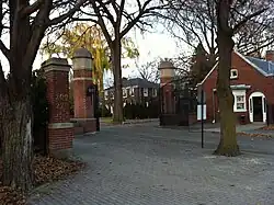The main structure (the Upper School), constructed between 1959 and 1960, central on the campus, and with a dominant clock tower, houses the secondary school component of the college, in a quadrangle form. Laidlaw Hall, the principal assembly hall, featuring a full theatre stage and a pipe organ, is attached to the west end of the Upper School and, at the other end, is the Memorial Wing, the school's main infirmary.[60] Closing the north end of the main quadrangle (which is the location of the statue of the Lord Seaton, installed in 1934[61]) is one building, built in 1932, that contains the two boarding houses, as well as two private residences for the associated boarding masters,[41] adjacent to which is the school chapel, donated by Governor General Vincent Massey.[62]