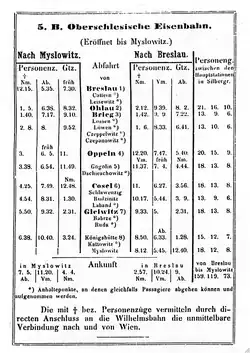 Timetable of the Upper Silesian Railway shortly after its connection to the Emperor Ferdinand Northern Railway in October 1848