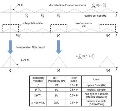 which is equivalent to Eq.2, regardless of the value of That equivalence is depicted in the second graph of Fig.2. The only difference is that the available digital bandwidth is expanded to , which increases the number of periodic spectral images within the new bandwidth. Some authors describe that as new frequency components.[7] The second graph also depicts a lowpass filter and resulting in the desired spectral distribution (third graph). The filter's bandwidth is the Nyquist frequency of the original sequence.[A] In units of Hz that value is but filter design applications usually require normalized units. (see Fig 2, table)