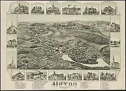 Upton was originally the home of the Nipmuc, who inhabited most of central Massachusetts. The town was first settled in 1728. Residents in outlying areas of surrounding towns were finding it difficult to fulfil the obligation to attend church every Sunday, so they petitioned the state for creation of a new town central to their homes, and in 1735 Upton was incorporated, taking land from Hopkinton, Mendon, Uxbridge, and Sutton.[1]