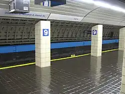 The first PATH stop in New York is at the Christopher Street station; service continues uptown to the 33rd Street terminal, making intermediate stops at Ninth Street, 14th Street, and 23rd Street.[5] Two stations formerly existed at 19th Street and 28th Street. The ornately designed stations in Manhattan featured straight platforms, each 370 feet (110 m) long and able to accommodate 8-car consists.[6] The stations underneath Sixth Avenue (14th, 19th, 23rd, and 28th streets, and the original 33rd Street Terminal) contain round columns with scrolls and the station name near the ceilings. The exposed steel rings of the tunnel's structure can be seen at Christopher and Ninth streets.[7]