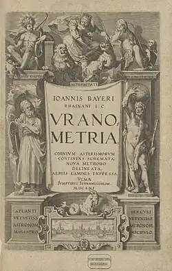 Uranometria is a star atlas produced by Johann Bayer. It was published in Augsburg in 1603 by Christoph Mang (Christophorus Mangus)[1] under the full title Uranometria: omnium asterismorum continens schemata, nova methodo delineata, aereis laminis expressa (from Latin: Uranometria, containing charts of all the constellations, drawn by a new method and engraved on copper plates). The word "uranometria", from Ancient Greek οὐρανός (ouranós) 'sky, heavens' and μέτρον (metron) 'measure', literally translates to "measuring the heavens".