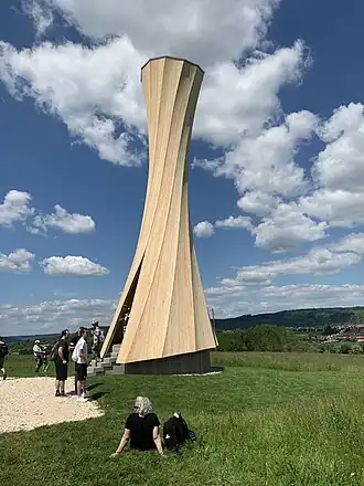The tower is one of sixteen small buildings constructed along the Rems river valley in the spring of 2019 for the Remstal Gartenschau 2019.[1] The design and structural engineering for the tower was completed by the Institute for Computational Design and Construction (ICD) and the Institute of Building Structures and Structural Design (ITKE), at the University of Stuttgart in collaboration with the Wood Materials Science Group at ETH Zurich and the construction company Blumer-Lehmann AG in Gossau.[2] The tower is open to the public and is directly accessible by foot or bike.