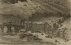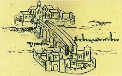 In 1581, a tower was built on the first arch of the bridge from Aquende, housing the town hall, the courthouse, and a butcher shop. Since the 16th century, the bridge had been in a poor state. It had seven arches, a curved profile, and a narrow roadway. Later, a new tower was built on the first pier of Allende, which served as a prison. Altogether, the bridge's structures formed a true fortress over the water.[13]