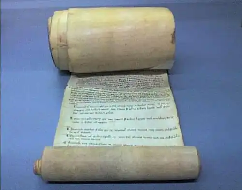 The term is from the Old High German ur-beran or the Middle High German erbern for "bring", "create" or "an income derived". It was used for economic, administrative or legal purposes as a directory of real estate, taxation, and the services owed a land holder (such as a monastery or noble)[1] especially in the Habsburg lands. The panels of an urbarium, which may be recopied several times to create a clean copy, were either stored as a scroll (German: Rödel) or the strips of parchment were sewn together to create a codex,[2] or were handwritten on preprinted forms in more recent centuries, as with Empress Maria Theresa's urbarial survey of the Kingdom of Hungary in the 18th century.
