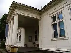 The Urdi House measures 250 square meters (2,700 sq ft)[4] and consists of a single story covered by a double hip roof. The front side, which faces to the northeast, features a portico with a triangular pediment supported by four columns with Doric capitals.[4][5] The part of the wall below this projecting roof is set back relative to the rest of the northeast wall, forming a large area under the gable offering a place to sit that is partially protected from the weather with views of the city and the eastern mountains around Bergen. The recessed wall also creates a shaded area that contrasts with the columns.[4]