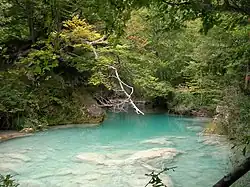 Urederra (from the basque; ur- "water", -ederra "beautiful") is the natural exit of the aquifer created in the rock massif karst of Urbasa, Navarre. The river rises in The Natural Park of Urbasa-Andía (Sierra de Urbasa), near the village Baquedano. It is 19 km long and flows into the Ega River, which is a tributary of the Ebro. The first emerge is produced in a 713 metres high clift in the southern ledge of the rock massif and makes a more than 100 metres waterfall which with the passing of the years has modelled a rocky and karstic landscape.[1]