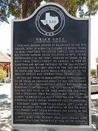 Uriah Lott was born January 30, 1842, in Albany, New York. In his early twenties he moved to Illinois for the Chicago and Alton Railroad. In 1867 he moved from Illinois to Corpus Christi where he found a passion and understanding for railway expansion. Before finding his new passion for railway expansion he owned a small store in Corpus Christi in 1867. He would later go on to work as a county clerk for a brief time as well as becoming a ranch supply salesman. He would go on to start another company of his own in 1869, U.Lott & Company. This company was a commission and forwarding company. After creating his own company his interests shifted to deep water ports. He was interested in securing one at Corpus Christi's port. On June 15, 1871, he joined the board of the Corpus Christi Navigation Company. His goal was to help improve the Corpus Christi ship channel.[1]