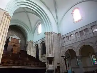 The side naves are now aisles that give access to the temple. The central nave has been closed with a large wall to form the space dedicated to liturgical use.