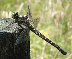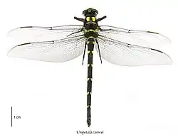 Its yellow and black body can be up to 95 millimetres (3.7 in) long, with a wingspan up to 130 millimetres (5.1 in), making it the largest dragonfly in New Zealand. Females are slightly larger than males. The bodies of both the female and male are dark brown, with pale spots on the abdomen and thorax. Males have petal-shaped appendages at the tip of the abdomen.[5] Uropetala carovei can be distinguished from the similar Uropetala chiltoni, which occurs in the mountains of the South Island, by its all-black labrum (lacking the large pale blotch on Uropetala chiltoni), and its brown to yellowish leg femur segments (which are black in Uropetala chiltoni).[6]