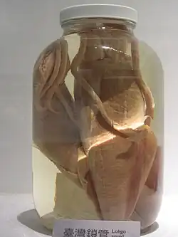 The main fishing grounds of this species are located in the Penghu Islands on both sides of the Taiwan Strait and the South Fujian Sea,[7] but it can also be seen in the northern part of the Beibu Gulf in Guangxi, around Hainan Island, Nanpeng Islands, and the South China Sea.[7] The peak period of fishing is from May to June,[11][8] but in Hong Kong sometimes they can be caught in April. Compared with other cuttlefish or squid, its taste is thinner and sweeter, and it is generally used to stir-fry, stir-fry or eat as sashimi.[8] U. chinesis when compared to other squid species like U. edulis seems to grow faster and have larger mantles.[12] This could attribute to people preferring U. chinesis over other squid species for eating.