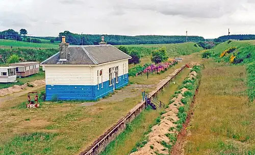 The Moray Coast line was predominantly single track apart from a double track section between Buckie and Portessie.[9] Track lifting took place shortly after closure in 1968.[9] The station site was used as a caravan site for a while,[12] but the station has now been demolished and a private dwelling occupies the site with landscaped grounds.