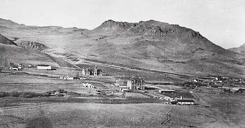 In March 1860, Jesuit priests established St. Peter's Mission on the Sun River about 8 miles (13 km) upriver from Fort Shaw, Montana. They moved the mission 2 miles (3.2 km) downstream in 1862, but this location proved difficult for agriculture. In April 1866 the mission moved again, this time to a position 2 miles (3.2 km) south of Bird Tail Rock (which is 15 miles (24 km) south of the modern town of Simms, Montana). The mission closed almost immediately due to hostility from the Piegan Blackfeet, but reopened in 1874. The mission moved again in 1881 to Birch Creek (a point about 9 miles (14 km) west-northwest of Cascade, Montana).[1][2] In January 1884, the new (and founding) Bishop of the Roman Catholic Diocese of Helena, Jean-Baptiste Brondel, invited the Ursuline religious order to join the Jesuits at St. Peter's Mission and assist them in teaching converted Native Americans. Leader of the Toledo chapter, Mother Amadeus (Sarah Therese Dunne), led five Ursulines to St. Peter's in October. They quickly established a boarding school for girls (open to children of settlers and Native Americans). The Jesuits gave the nuns a farm to help them survive, and promised to pay them $200 a year to teach boys if more nuns could be brought to the mission.[3] The Ursulines built a large stone building between 1882 and 1887 which served as their school and convent. The school later moved into a two-story wood-frame building, and the sisters built a bakery, barn, corral, laundry, and workers' housing. The Ursulines—who believed in music and art training as well as education in reading, math, and science—also built a three-story opera house at St. Peter's in 1896.