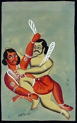 Urubhanga or Urubhangam, (English: Shattered Thighs ) is a Sanskrit play written by Bhasa in the 2nd or 3rd century CE.[1] Based on the well-known epic, the Mahābhārata, by Vyasa, Urubhanga focuses on the story of the character Duryodhana during and after his fight with Bhima. Although Urubhanga contains the same core storyline as that in the Mahābhārata, Bhasa's altering of certain aspects results in a different presentation of the story.[2] The most extreme of these alterations is Bhasa's portrayal of Duryodhana, who, in the Mahābhārata, is viewed as a villain, but in Urubhanga is given more human qualities.[3] Bhasa's presentation of Duryodhana's side of the tale adds certain tragic elements to the play.[4]