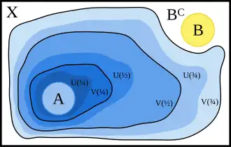 Let and be disjoint closed subsets of . The main idea of the proof is to repeatedly apply this characterization of normality to and , continuing with the new sets built on every step.