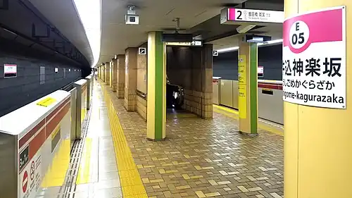 ![]() Platform level of Ushigome-kagurazaka Station | |||||||||||