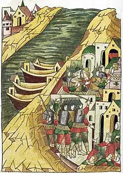 In 1371, the ushkuyniks sacked Yaroslavl, Kostroma and other Upper Volga cities. Three years later they sailed with upwards of ninety ships to pillage the Vyatka region. In 1375, they defeated the militia of Kostroma and burnt the city to the ground. The destruction was so severe that Kostroma had to be rebuilt elsewhere. After that, they looted Nizhny Novgorod and sailed down the Volga to Astrakhan, where they were annihilated by a Tatar general.