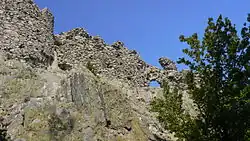 The fortress occupies an area of 1,290 m2 and has the shape of an open quadrangle resembling the of Cyrillic letter of "П".[1][2][4] It rises on an elongated, rocky, steep peak with very good visibility, covering a long distance in the surrounding area. The sheer cliffs to the north and northwest descend almost vertically. Far to the northeast there is visibility to another important castle in the region, Monyak.[3] Some 1.7 km northeast of Ustra are traces of another medieval fortress, part of the same fortification system.[9]