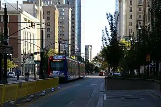 Main Street is the most important commercial street in Salt Lake City, Utah, United States though it also extends south into the cities of South Salt Lake, Millcreek, and Murray. Its commercial importance is almost totally derived from the few blocks of the street which are immediately south of Temple Square that have attracted banks, major retailers, and heavy foot traffic throughout Salt Lake City's history; the long southern extension of Main Street south of about 500 and 600 South, in contrast, is always in the shadow of State Street (one block to the east), which (due to width, speed limit, and restraint of cross traffic) is more designed for the long-distance automobile traffic that is common away from downtown.