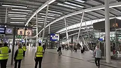 Between 2011 and 2016, the station underwent a major reconstruction as one of the NSP[4] projects of the Dutch government and as part of a general reconstruction of the Utrecht station area.[5][6] The station hall was replaced by a new, much larger hall, housing all modes of public transport. The new structure with its curved roof, was designed by Benthem Crouwel Architekten. The roof has three curves: a large one in the middle for the railway station and two smaller ones for the bus/tram stations on either side. New sheltering roofs were built for all platforms and the station was separated from the Hoog Catharijne shopping area.[7]