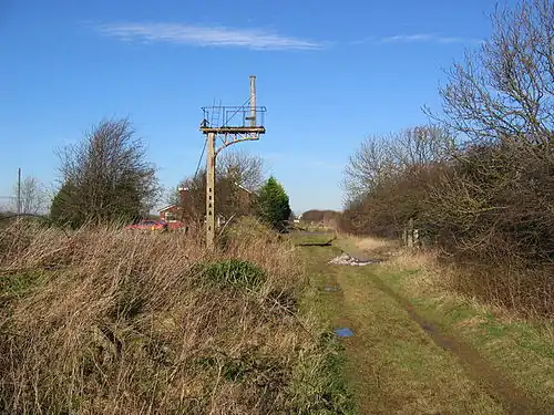 The station was opened on 11 December 1905[2] to coincide with the introduction of a motor train service by the Great Northern Railway.[3] It consisted of two low parallel halt platforms to the south of the level crossing over Pear Tree Lane; lamps were provided on both platforms, but only the down platform had a waiting shelter for passengers: a small wooden hut equipped with a heating stove.[4][5] A crossing keeper's cottage lay to the north of the crossing on the down side[6] which was of standard East Lincolnshire Railway design similar to that seen at Fotherby Halt, Grainsby Halt, Holton Village Halt and Weelsby Road Halt, all of which pre-dated the opening of the respective halts.[7] Passenger services called at the station upon request only.[8] The station closed on 11 September 1961,[9] the same day as Fotherby Halt to the south which had also opened on the same day as part of the rail motor service.[10]