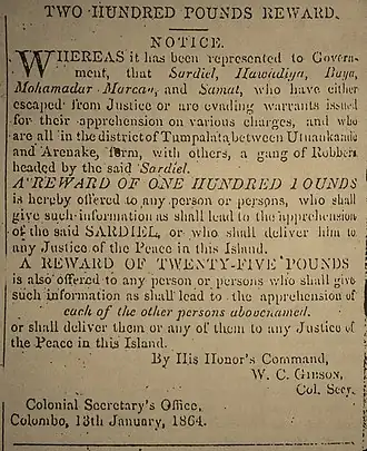 Deekirikevage Saradiel called Utuwankande Sura Saradiel, translation:Saradiel the Hero of Mountain Utuwan (Sinhala: උතුවන්කන්දේ සුර සරදියෙල්; 25 March 1832 – 7 May 1864) was a Ceylonese gang leader and bandit who became known as the "Robin Hood of Sri Lanka". Some Sri Lankan scholars place him in the context of regional insurgencies of against British Colonial rule rather than a manifestation of local lawlessness or economic justice. Due to superstition he was believed to have the power of not being seen and that he was bullet proof. Many believe that this is because he had Henaraja "yantra" on his arm which lent him such powers.