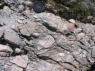The Croatian mountain chain Velebit is probably the richest area in karstic uvalas of the Dinarides, Poljak (1951) cited by Ćalić (2009) p. 70. The breccia in this chain – there known as Jelar breccia – show very extensive outcropping.[24] These highly permeable carbonate breccias are a prominent feature of "Middle Eocene to Middle Miocene" age faulting activities in the Velebit area, Vlahovic et al. (2012). The deep incision of Velebit's most prominent uvala Lomska Duliba can be explained by the presence of the Jelar breccias, Ćalić (2009), p. 72.[25]