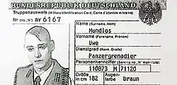 Mundlos was eventually promoted to the rank of Private, and to Private First Class in the reserves upon his retirement.[10] He was trained with assault rifles, machine guns and the Walther P1.[8] Mundlos had "performed well" as a gunner and assistant to his company squad leader, according to a certificate from the end of his military service.