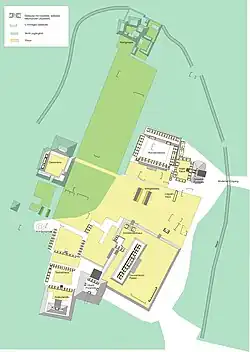 - The Nunnery Quadrangle was built from 900-1000, and the name related with nuns was assigned in the 16th century because it resembled a convent. The quadrangle consists of four palaces placed on different levels that surround a courtyard. Of the different buildings that make up this palatial complex, several vault tops have been recovered, they are painted and represent partial calendrical dates from 906 to 907 AD, which is consistent with the Chan Chahk’ahk Nalajaw period of government. The formal entrance, the hierarchy of the structures through the different elevations, and the absence of domestic elements suggest that this space corresponds to a royal palace with administrative and non-residential functions, where the ruling group must have had meetings to collect the tribute, make decisions, and dictate sentences among other activities.[6] These set of buildings are the finest of Uxmal's several fine quadrangles of long buildings. It has elaborately carved façades on both the inside and outside faces.