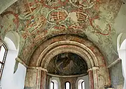 Vä Church contains some of the oldest—possibly the very oldest—church murals in Sweden.[36] They have been described as being "of excellent quality, also compared with the rest of Europe".[37] Their style is Italo-Byzantine, in the same tradition as e.g. the murals in the Chapelle des moines de Berzé-la-Ville (France), St. Gabriel's Chapel in Canterbury Cathedral (England) or the Znojmo Rotunda (Czech Republic).[38][39] In style they are closely related to those in Sigwardskirche in Wunstorf, Germany.[38] These stylistic traits may have arrived from Eastern Europe, perhaps conveyed through the many personal contacts between the Danish royal family and the nobility of Kievan Rus'.[40]