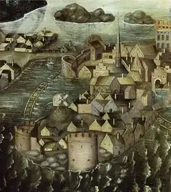 Along the western shoreline are several defensive structures of various ages. The wooden defence structure built along the shore around 1650 is absent in the painting, but the double row of piles protecting the western harbour is present. It served both as a defensive structure and, because a duty was imposed on all incoming ships, as an important source of income for the city. The western defence structures were neglected around 1500, which resulted in settlements being constructed between the western city wall and a shoreline constantly pushed westward by landfill, just as the painting renders it.[47]