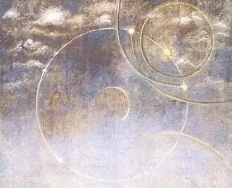 In the painting, the actual Sun is the yellow ball in the upper-right corner surrounded by the second circle. The large circle taking up most of the sky is a parhelic circle, parallel to the horizon and located at the same altitude as the Sun, as the painting renders it. This is actually a common halo, although a full circle as depicted is rare. Such parhelic circles are caused by horizontally oriented plate ice crystals reflecting sun rays. In order for a full circle to appear sun rays must be reflected both internally and externally.[56][57] The circle surrounding the Sun is a 22° halo, as the name implies located 22° from the Sun. While the painting depict it pretty much as it normally appears, it should be centred on the Sun and is misplaced in the painting.[58] The pair of arcs flanking the 22° halo and crossing each other are most likely a misinterpretation of a circumscribed halo. While the Sun is still low, it starts as a V-shaped upper tangent arc which gradually develops into something looking like the unfolding wings of a seagull. As the Sun ascends, in rare cases it finally joins with the lower tangent arc to form an ellipse which closes in on the circumscribed 22° halo.[59]