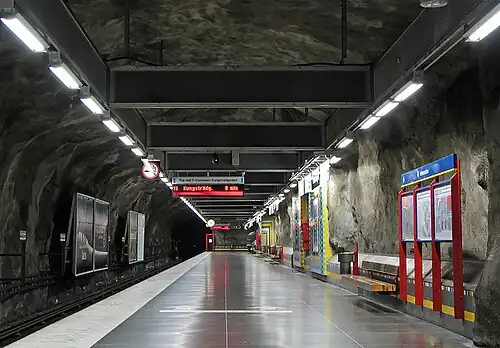 Västra skogen (Swedish: The Western Forest) is a station on the Blue Line of the Stockholm metro, in Huvudsta, Solna Municipality. The station was opened on 31 August 1975 as part of the first stretch of the Blue Line between T-Centralen and Hjulsta. The trains were running via Hallonbergen and Rinkeby. On 18 August 1985 the extension to Rinkeby was opened, and the stretch between Hallonbergen and Rinkeby was closed for passenger traffic.[2] It features one of the longest escalators in western Europe, 66 meters and with a vertical rise of 33 meters.[3] This part of Huvudsta was earlier called Ingentingskogen (The Nothing Forest) after a small farm called Ingenting; the name Ingenting (Nothing) was suggested as a name for the new station, but rejected.