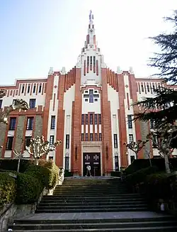 Chronologically the first major project was headquarters of the insurance company La Vasco Navarra (1924).[43] Along few large residential villas[44] the same year Eusa produced the plan of the Hijas de María Immaculada monastery.[45] Puente de San Jorge in Alcoy turned out to be the only bridge he designed (1926).[46] Casa de Misericordia was the first monumental, multi-volume establishment, designed with no restraints related to size. It included a number of in-built facilities, like a large chapel (1927).[47] Residential villa for Eguinoa brothers demonstrated ingenuity embodied in mid-size construction (1928).[48] Eusa returned to religious theme with the church of Padres Paúles, known as La Milagrosa (1928).[49] Colegio de los PP. Escolapios, a 3-storey enormous multi-wing building, was Eusa's most ambitious project so far and is one of his most iconic works (1928).[50] Basilica of Nuestra Señora del Puy in Estella turned an essay in geometry (1929),[51] while residential multi-dwellings at Plaza Príncipe de Viana marked his urbanistic capacity (1930).[52] A 7-storey edifice hosting Casino Eslava, with meticulously designed interior, was Eusa's last major work of the monarchy (1931).[53]