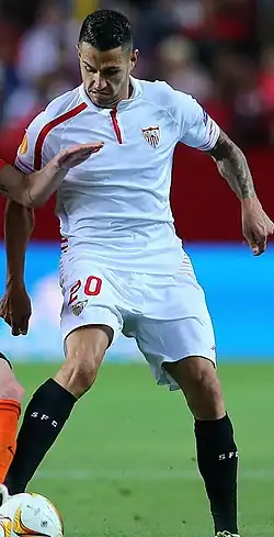 In his first season in Andalusia, Vitolo played 45 games in all competitions and scored eight times; this included four in 16 matches in the club's victorious run in the UEFA Europa League.[11] On 12 March 2015 he scored the fastest-ever goal in the continental competition, finding the net after just 13 seconds to help to a 3–1 away win against fellow Spaniards Villarreal CF;[12] he was surpassed on 15 September 2016 by Jan Sýkora from FC Slovan Liberec, who netted against Qarabağ FK at 10,69.[13][14]