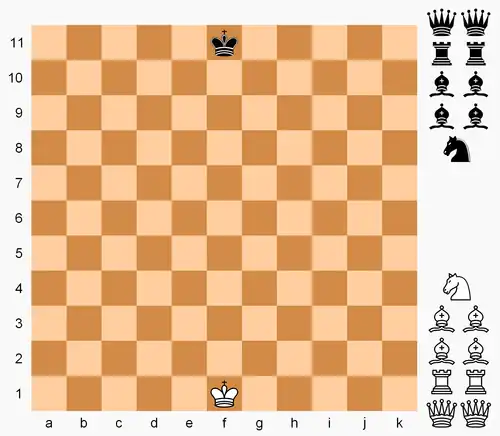 This variant is for three[a] players on a 10×10 board. Each player has a standard set of pieces in their own colour, including an extra king,[b] but no pawns.