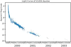 V1494 Aquilae is classified as a fast nova, meaning it faded from peak brightness by more than 3 magnitudes in less than 100 days.[11] During its decline, V1494 Aql produced unusual variations in its x-ray radiation, including a bright burst lasting several minutes. During 2000, the x-ray spectrum developed from a hard (high energy) emission-line spectrum to a spectrum typical of a super soft X-ray source. The x-ray intensity varied with a period of about 40 minutes, probably due to pulsations induced in the white dwarf by its re-kindled hydrogen fusion.[8]