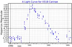 V518 Carinae was discovered to change in brightness after analysis of Hipparcos photometry.[11] The amplitude of the variations seen is 0.2 magnitudes, with possible periods of 100 and 971 days.[12] It is classified as a γ Cassiopeiae variable.[13][4]