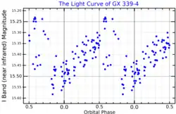 GX 339−4 is a moderately strong variable galactic low-mass X-ray binary (LMXB) source[1][2] and black hole candidate that flares from time to time. From spectroscopic measurements, the mass of the black-hole was found to be at least of 5.8 solar masses.[3]