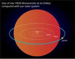 V838 Monocerotis was observed by use of the Palomar Testbed Interferometer, which indicated a radius of 1,570±400 R☉ (comparable to Jupiter's orbital radius), confirming the earlier indirect calculations.[16] At the currently accepted distance of 6,100 pc, the measured angular diameter in late 2004 (1.83 mas) corresponded to a radius of 1,200±150 R☉, but by 2014, it shrunk to 750±200 R☉, around 70 solar radii larger than Antares.[17] The expansion took only a couple of months, meaning that its speed was abnormal. Because the laws of thermodynamics dictate that expanding gases cool, the star became extremely cool and deep red. In fact, some astronomers argue that the spectrum of the star initially resembled that of L-type brown dwarfs. If that is the case, V838 Monocerotis was the first known L-type supergiant.[18] Since then, it has shrunk and heated up and is now considered an M-type supergiant. However, current estimates of the distance, and hence of the radius, are about 25% lower than assumed in those papers.[15]