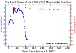 On January 6, 2002, an unknown star was seen to brighten in the constellation Monoceros, the Unicorn.[13] Being a new variable star, it was designated V838 Monocerotis, the 838th variable star of Monoceros. The initial light curve resembled that of a nova, an eruption that occurs when enough hydrogen gas accumulates on the surface of a white dwarf from its close binary companion. Therefore, the object was also designated Nova Monocerotis 2002. V838 Monocerotis reached a maximum visual magnitude of 6.75 on February 6, 2002, after which it started to dim rapidly, as expected. However, in early March, the star started to brighten again, particularly in infrared wavelengths. Yet another brightening in infrared occurred in early April. In 2003, the star returned to near its original brightness before the eruption (magnitude 15.6), but as a red supergiant rather than a blue main-sequence star. The light curve produced by the eruption was unlike anything previously seen.[2] In 2009, the star was about 15,000 L☉,[11] which, in the absence of extinction, would correspond to an apparent magnitude of 8.5.[a]
