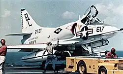 ![]() An A-4B Skyhawk from VA-216 Black Diamonds aboard USS Saratoga, 1967. | |