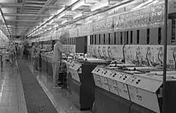 The Kombinat Mikroelektronik Erfurt was formed in 1978 when the VVB Bauelemente und Vakuumtechnik was split into VEB Kombinat Elektronische Bauelemente Teltow for passive electronic components and VEB Kombinat Mikroelektronik Erfurt for active electronic components. However, the history of many of the individual plants reaches back further, in some cases to before the Second World War. In 1971 the first integrated circuits had been manufactured — the D100C (TTL) by Halbleiterwerk Frankfurt (Oder) and the U101D (PMOS logic) by Funkwerk Erfurt.[1][2] To put this into perspective, the first TTL circuits went into production in the US 10 years and at Siemens in West Germany 5 years before East Germany. The first microprocessor, the U808D, followed in 1978, 6 years after the Intel 8008 that the U808 was cloned from. Further milestones were the U880 (Zilog Z80 clone) in 1980 and the first 16-bit microprocessor U8000 (Zilog Z8000 clone) in 1984.[3] The ruling Socialist Unity Party of Germany had identified the development of the microelectronics sector as a primary goal. Huge sums were spent in order to catch up to the West — between 1986 and 1990 about 7% of the country-wide industry investment.[1] However, this effort was hampered by several factors: the general inefficiency of the planned economy, insufficient cooperation with other Comecon countries, and western CoCom export restrictions that prevented the importation of semiconductor manufacturing equipment.[4] Nonetheless, the development program achieved samples of a 1Mbit dRAM chip (U61000) in 1988 and a 32-bit processor (U80701) in 1989. Mikroelektronik "Karl Marx" Erfurt achieved a feature size of 3 μm on 4-inch wafers in 1984 (plant ESO I), 2.5 μm in 1988 (plant ESO II), and 1.5 μm on 5-inch wafers in 1990 (plant ESO III).[1] In 1989, Halbleiterwerk Frankfurt (Oder) produced 110 million integrated circuits and Mikroelektronik "Karl Marx" Erfurt produced 35 million.[1]