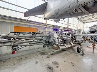 The aircraft was based on a trapezoidal frame without any skin panels. Deviating from the vectored thrust engine concept of the VAK 191B, five Rolls-Royce RB.108 turbojet lift engines with 9 kN (2,000 lbf) thrust each were mounted vertically. In addition to extensive sensor equipment, the rig used an auxiliary gas turbine for autonomous electrical power supply, it was also fitted with a Martin-Baker ejection seat.[3]