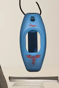 VITAband is a silicone encircling strip worn on the wrist. It can be referred to a bracelet-like band of a wristwatch, to the cuff or other part of a sleeve that covers the wrist. It is a lightweight, waterproof and hypoallergenic[1] flexible wristband that is used when jogging, running, cycling or hiking, or when carrying a wallet is inconvenient.[2][3] VITAband holds emergency medical information and Visa RFID credit card information.[2] The wristband has two unique features.[4] It comprises an integrated Visa Debit card with payWave wireless functionality and a toll-free phone number with unique identity code that can be used by EMTs to retrieve health information and contacts in case of an accident or health emergency.[4][5][6]